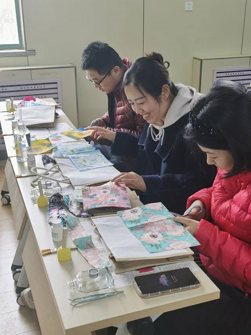 指导老师首先介绍了蝶骨巴特包的由来和永生花浮游瓶的寓意,蝶骨巴特源于法文,意为将美丽的图案裁剪拼贴于饰物表面,展现创意设计的装饰艺术,蝶骨巴特包即拼贴了图案装饰的帆布手提袋;永生花又被称作“永不凋零的花”,寓意“永远的幸福”。随后,在老师的讲解下,大家纷纷投入制作,用心设计、选材,精心制作、装饰,每一个步骤都极为耐心、细致,每一件作品都饱含着环境人对绿色低碳事业的热爱和对美丽中国建设的憧憬。