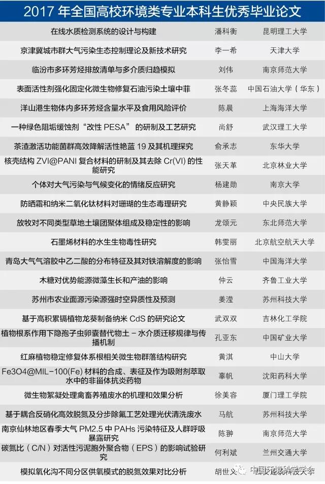 教育部高等学校环境科学与工程类专业教学指导委员会与中国环境科学学会联合组织的2017年度全国高校环境类专业本科生优秀毕业设计(论文)评选活动共收到作品121篇。按照《全国高校环境科学与工程类专业本科生优秀毕业设计(论文)评选管理办法》规定,经专家初审和复审,并通过中国环境科学学会官方网站公示,36篇作品获得“2017年度全国高校环境类专业本科生优秀毕业设计(论文)”称号。在“中国环境科学学会2017年科学与技术年会”开幕式上,教指委副主任委员周琪教授、环保部科技司邹首民司长向获奖代表颁发了证书。获奖者来自哈尔滨工业大学、浙江大学、天津大学、四川大学、西安建筑大学、重庆大学、中国矿业大学等高校,获奖作品皆能反映学科前沿,对国民经济、科学技术、社会实践有较大的实用价值或理论意义。