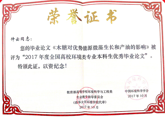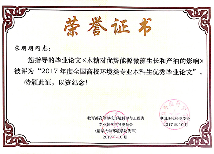 2017年10月20日,教育部高等学校环境科学与工程类专业教学指导委员会与中国环境科学学会公布了“2017年度全国高校环境类专业本科生优秀毕业设计(论文)”的获奖者名单,在环境学院的支持下,由宋明明老师指导仲云同学做的本科毕业论文——“木糖对优势能源微藻生长和产油的影响”获得“2017年度全国高校环境类专业本科生优秀毕业设计(论文)”。