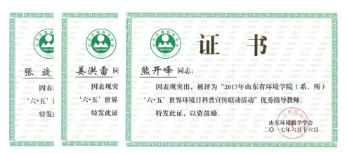 近日,从刚刚闭幕的山东环境科学学会2017年会上传来喜讯,齐鲁工业大学环境科学与工程学院荣获“2017年山东省环境学院(系、所)‘六•五’世界环境日科普宣传联动活动优秀组织单位”荣誉称号,熊开峰、张旋、姜洪雷老师荣获“优秀指导老师”荣誉称号,刘俊、宋泓辰、王琳琳、张高健等同学荣获”优秀志愿者”荣誉称号,由陈侠老师指导、姬国庆、包云帆等同学撰写的论文获山东省第三届环境类专业大学生科技竞赛学术论文类二等奖。