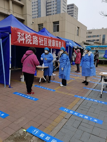 在核酸检测之前,认真参加测前培训,不懂就问,检测时,认真负责,遇到有疑问、排队有情绪的居民,耐心给他们讲解、解释,在上午的检测高峰期过后,冒着寒风随同社区人员,按照统计名单,去周边小区给行动不便,不能下楼的老人入户检测。穿梭在各个小区,各个楼层,用担当践行,用汗水和实际行动筑起社区居民健康防线。