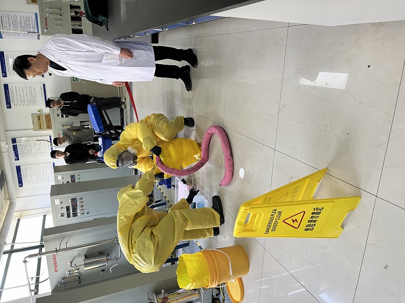 本次演练预设场景是环境学部A106实验室发生了500mL浓盐酸的泄漏,环境学部实验教学中心主任李书平和志愿师生一起模拟演示实验室浓盐酸泄漏后现场涉及人员的救护、有序撤离、现场封锁、事故上报,应急救援人员的个人防护、消除危险源、现场恢复、事故发生后的调查与评估等规范化应急处置流程。