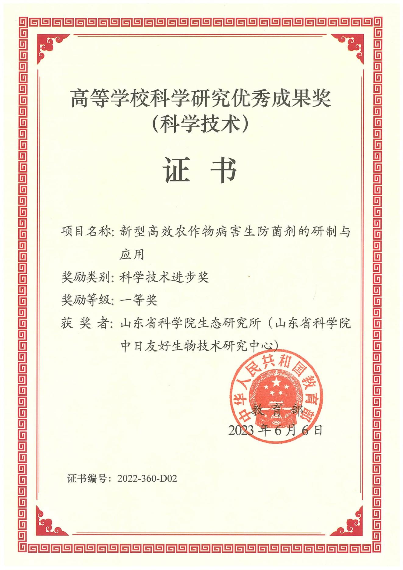近日,教育部颁发了2022年度高等学校科学研究优秀成果奖(科学技术)获奖成果证书,我所环境微生物团队扈进冬高级工程师和李纪顺研究员参与完成的“新型高效农作物病害生防菌剂的研制与应用”项目获得了教育部高等学校科学研究优秀成果奖(科学技术)——科技进步一等奖。