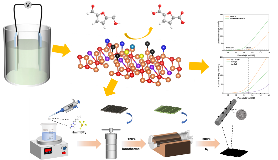 近日,齐鲁工业大学(山东省科学院)环境学部废弃物资源化技术团队在生物质电化学升级方面取得研究进展。相关成果以“Ionic liquid dopant induced 3D hierarchical CuO nanostructures with doped heteroatoms and highly dispersed Ag for electrochemical upgrading of 5-hydroxymethylfurfural(离子液体掺杂剂诱导的具有掺杂杂原子和高度分散银的三维分层氧化铜纳米结构,用于 5-羟甲基糠醛的电化学升级)”为题发表在《chemical engineering journal》(学术影响力在143个工程、化工(Engineering Chemical)期刊中排名第四(4/143),2023年IF=15.1)上。齐鲁工业大学(山东省科学院)为该论文完成第一单位,环境学部硕士研究生李超凡为论文的第一作者,臧立华教授、马云倩副教授为通讯作者。该项研究工作受到山东省自然科学基金、河南省自然科学基金、齐鲁工业大学(山东省科学院)科教产融合重大创新项目等资助。
