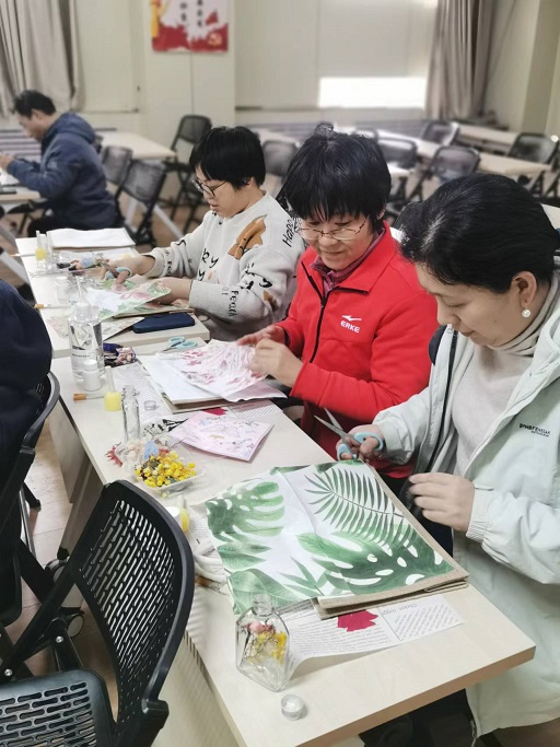 活动现场精心摆放着各类工具材料,图案丰富的印纸、款式各异的丝巾、色彩斑斓的干花、精致趁手的工具……,瞬间激发起大家手工制作的热情与兴趣。