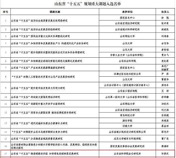 近日,山东省发展和改革委员会网站公开发布了《山东省“十五五”规划重大课题入选公告》,生态研究所许崇庆所长主持申报的“山东省“十五五”推进碳排放双控 加快绿色低碳转型发展研究”课题获批立项。