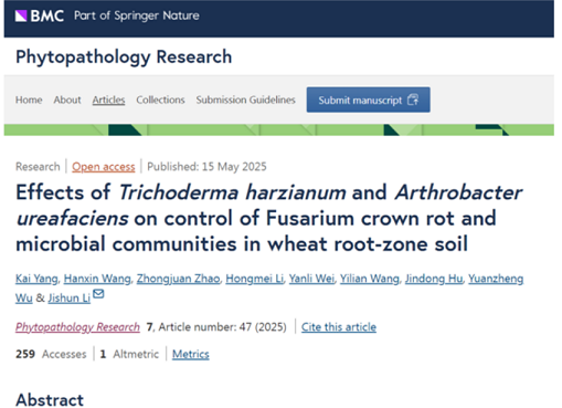 环境微生物团队深挖木霉与节杆菌协同作用机制,获得的一项创新性研究于5月15日以“Effects of Trichoderma harzianum and Arthrobacter ureafaciens on control of Fusarium crown rot and microbial communities in wheat root-zone soil”为题在国际著名学术期刊Phytopathology Research在线发表,研究评估了哈茨木霉LTR-2与产脲节杆菌DnL1-1对小麦茎基腐病的防控效果及对小麦根区土壤微生物群落的影响。文章链接:https://doi.org/10.1186/s42483-025-00331-7。