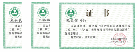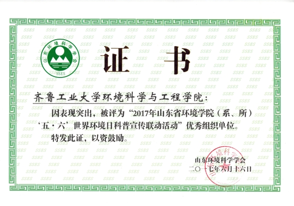近日,从刚刚闭幕的山东环境科学学会2017年会上传来喜讯,齐鲁工业大学环境科学与工程学院荣获“2017年山东省环境学院(系、所)‘六•五’世界环境日科普宣传联动活动优秀组织单位”荣誉称号,熊开峰、张旋、姜洪雷老师荣获“优秀指导老师”荣誉称号,刘俊、宋泓辰、王琳琳、张高健等同学荣获”优秀志愿者”荣誉称号,由陈侠老师指导、姬国庆、包云帆等同学撰写的论文获山东省第三届环境类专业大学生科技竞赛学术论文类二等奖。