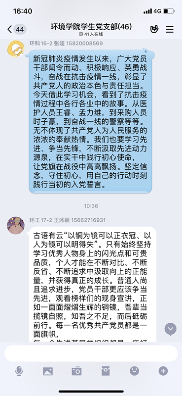 为庆祝中国共产党成立99周年,提高党组织凝聚力,增强党员在特殊疫情期间党性修养和政治觉悟,根据上级统一部署,结合“我来讲党课”活动,环境学院学生党支部特开展庆“七一”主题党日系列活动。包括组织通过“灯塔大课堂”第十一课《榜样讲党课》栏目,认真收看“抗疫榜样”在抗击新冠肺炎疫情期间的感人事迹;观看影片《建党伟业》;学习***总书记给复旦大学《共产党宣言》展示馆党员志愿服务队全体队员的回信精神;参加腾讯会议“学党史 知党情”红色文化知识讲座。收看后党员同志深刻学习贯彻习总书记关于疫情防控工作的重要讲话精神,针对党课内容谈收获、谈体会,学习榜样事迹、领会榜样精神、感受榜样力量,对标定位,提高党员使命意识。在观看了“榜样讲党课”的主题党课之后: